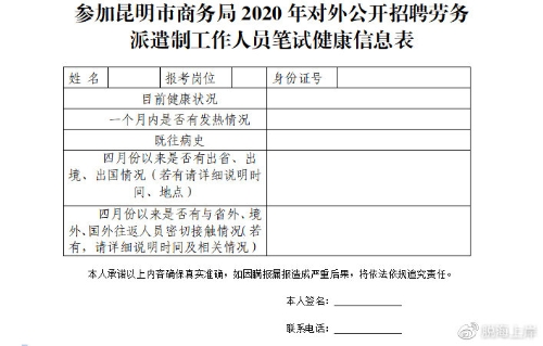 根据疫情防控要求,请参加笔试的考生,将健康信息表下载打印,如实填写相关内容并签字,同时用手机扫描云南健康码,把健康码截图后,一并打印,考试当天提交考场工作人员。
