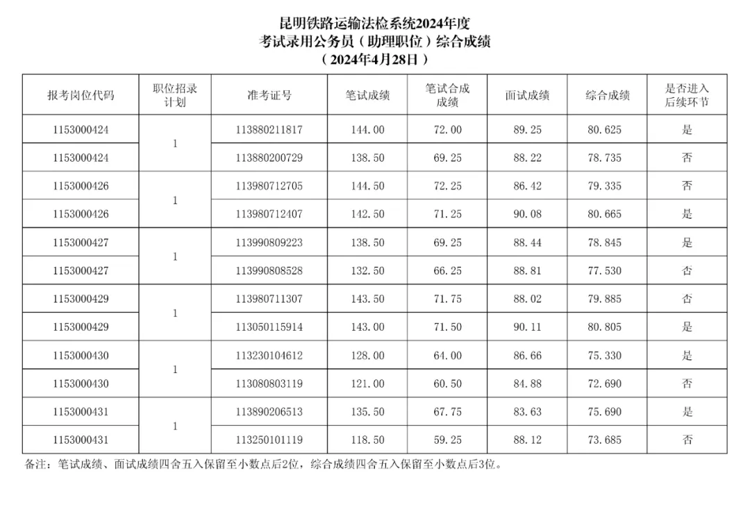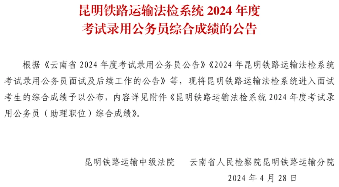 昆明铁路运输法检系统2024年度考试录用公务员综合成绩的公告