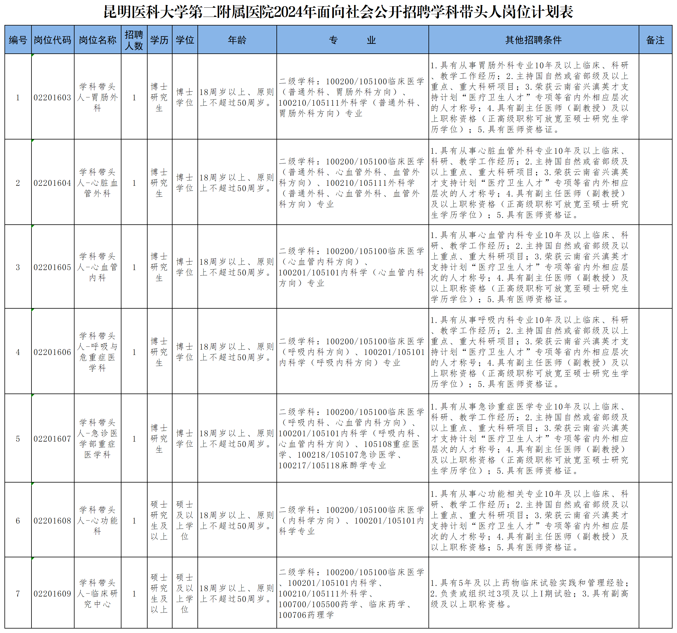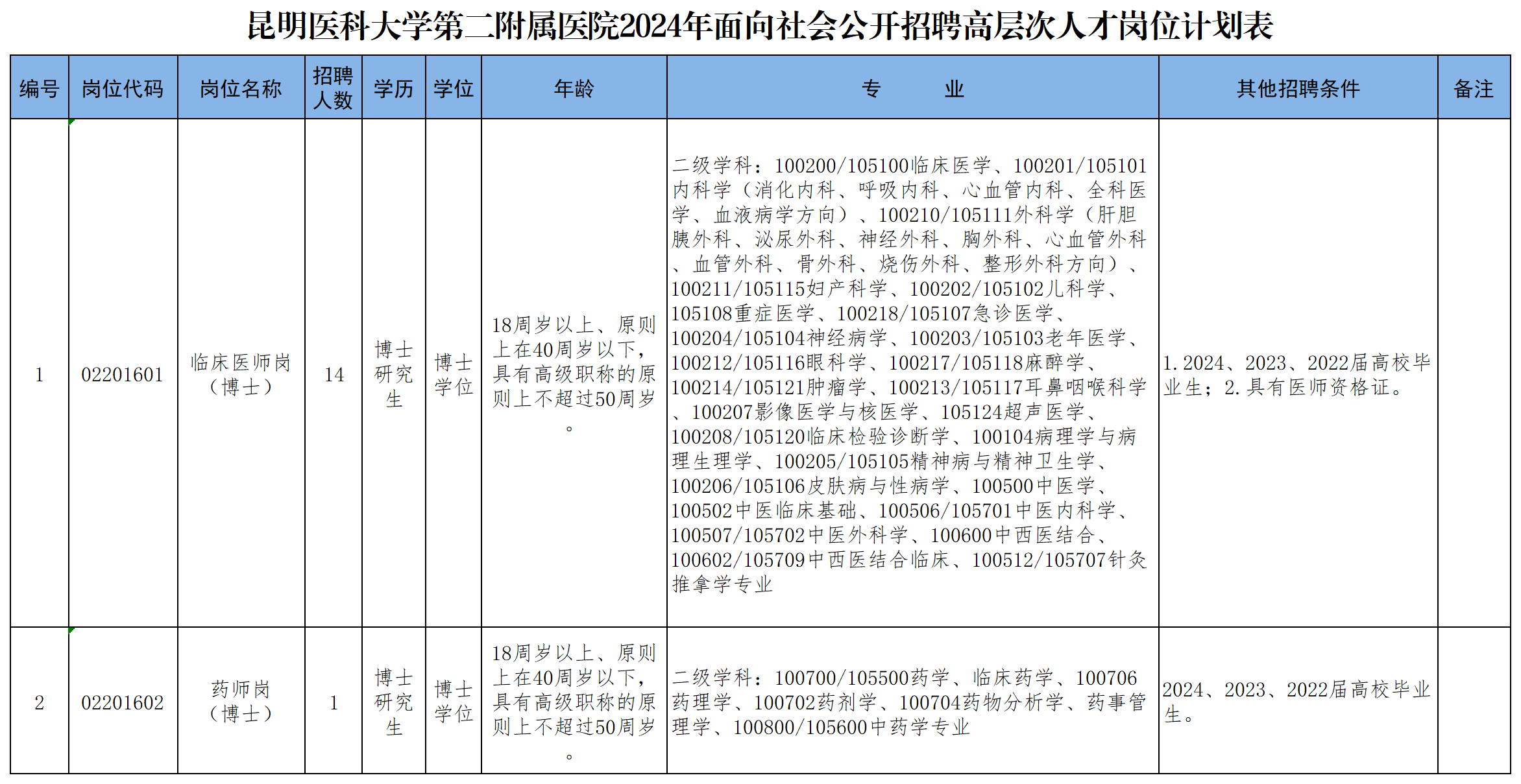 附件:昆明医科大学第二附属医院2024年面向社会公开招聘高层次人才岗位计划表.xlsx