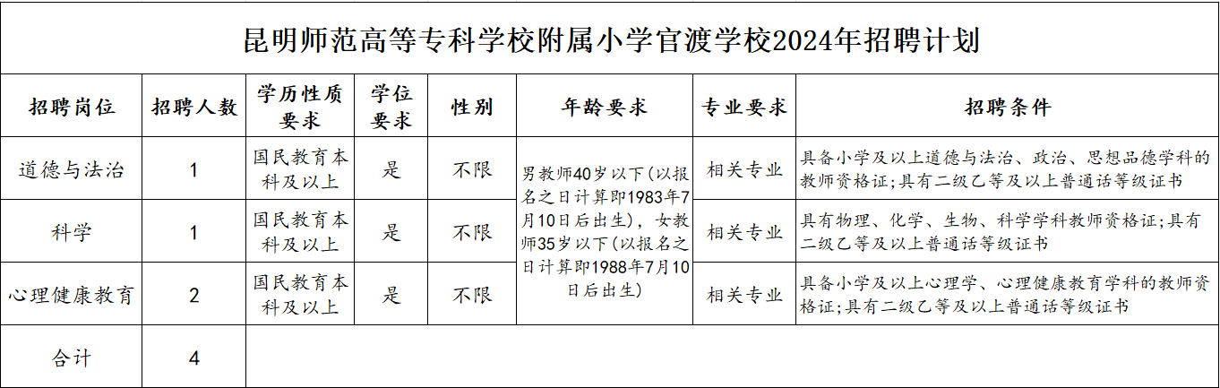 在官渡区教育体育局的领导下,为保障2024教师招聘工作的顺利进行,经昆明师专附小官渡学校、昆明师专附小彩云城学校两校协商,按照官渡区聘用制教师招聘工作指导意见及相关人事规定,结合学校工作实际,合并开展2024年度两校新教师招聘工作。