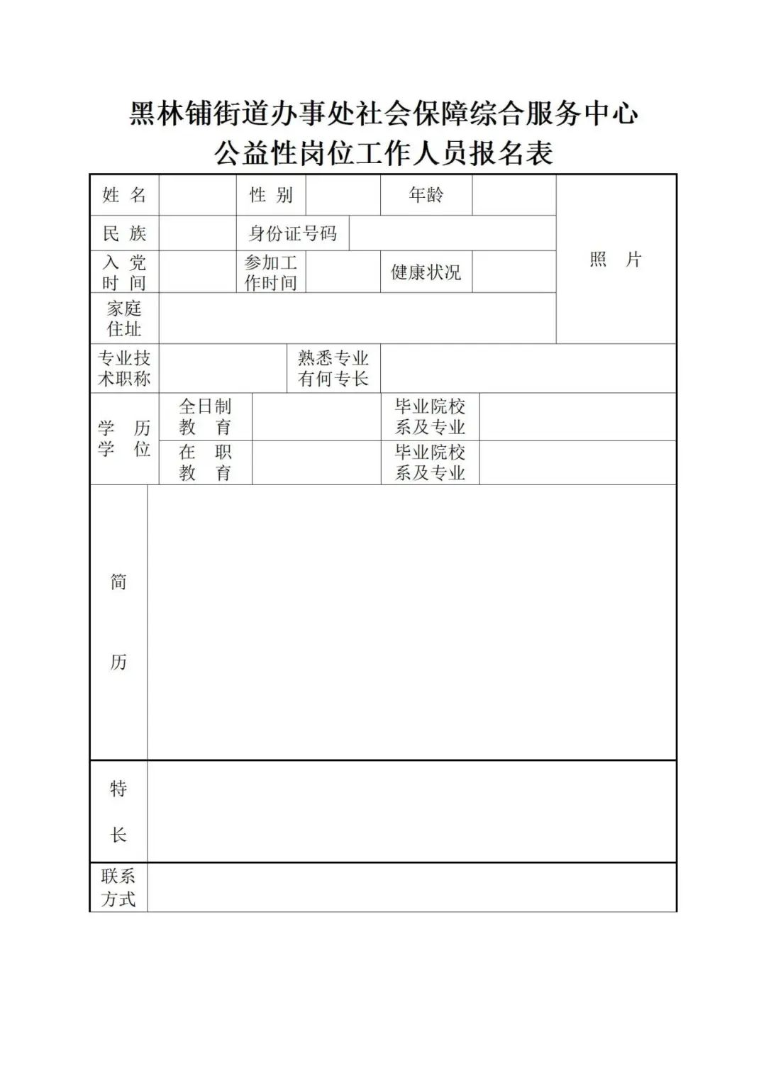 附件:黑林铺街道办事处社会保障综合服务中心公益性岗位工作人员报名表
