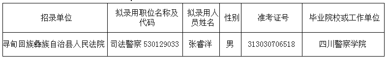 根据云南省2023年度考试录用公务员有关规定,经过笔试、资格复审、面试、体检、考察等程序,现将寻甸回族彝族自治县人民法院2023年度考试录用公务员拟录用人员名单予以公示。