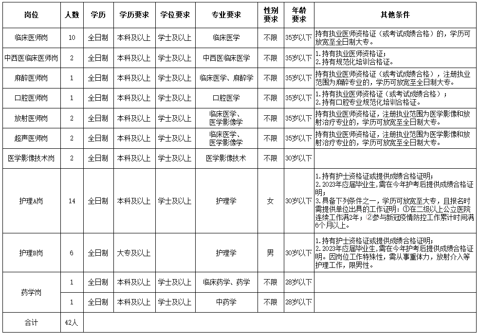 为进一步充实和优化医疗卫生人才队伍,丽江市古城区人民医院根据自身业务发展需要,发布了→(2023年公开招聘编外工作人员公告),面向社会公开招聘42名编外工作人员: