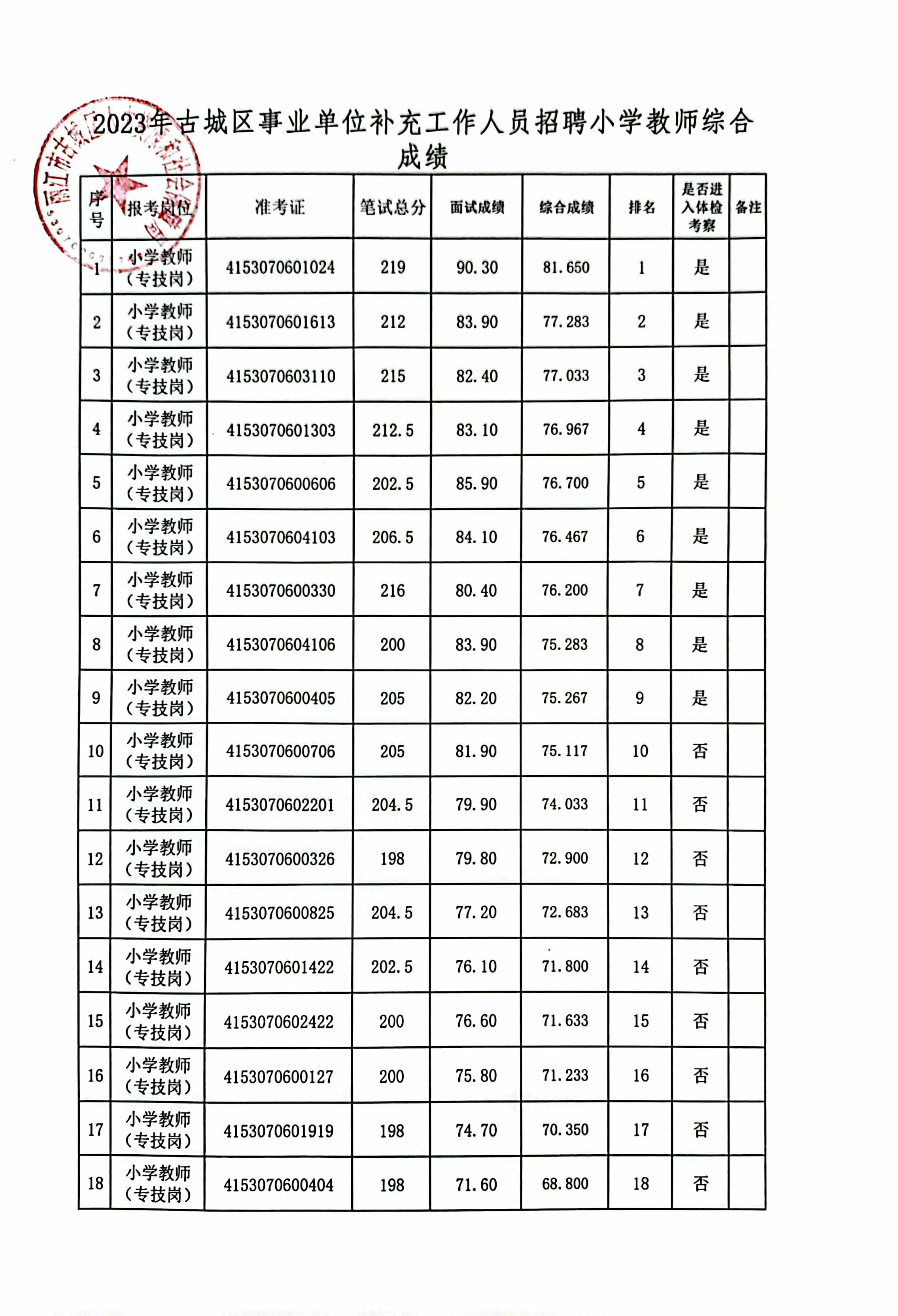 2023年古城区事业单位补充工作人员招聘小学教师综合成绩
