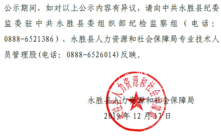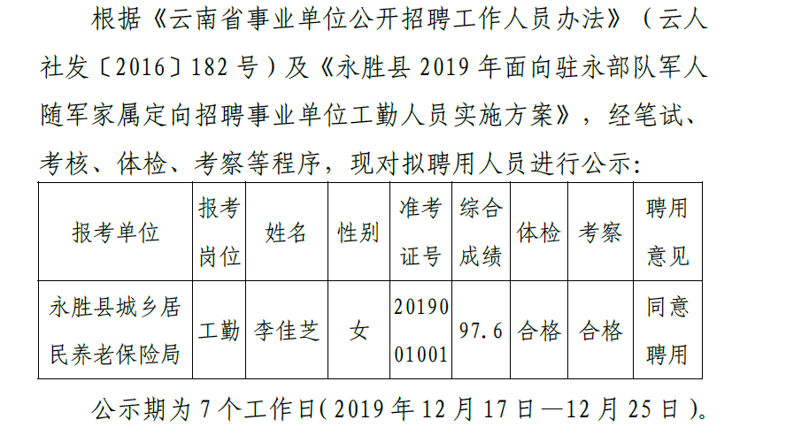 永胜县2019年面向驻永部队军人随军家属定向招聘事业单位工勤人员公示