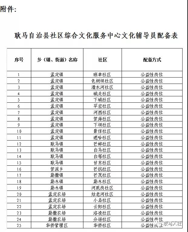 社区文化辅导员25名(附件:耿马自治县社区综合文化服务中心文化辅导员配备表)。