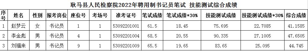 耿马县人民检察院2022年聘用制书记员招聘笔试技能测试综合成绩公示