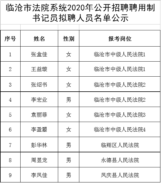 临沧市法院系统2020年公开招聘聘用制书记员拟聘人员名单公示