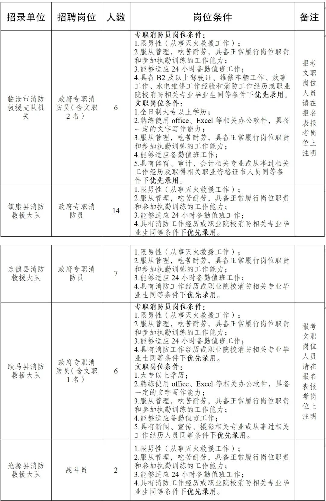 因工作需要,临沧市消防救援支队面向社会招聘政府专职消防员,现将招聘信息公告如下: