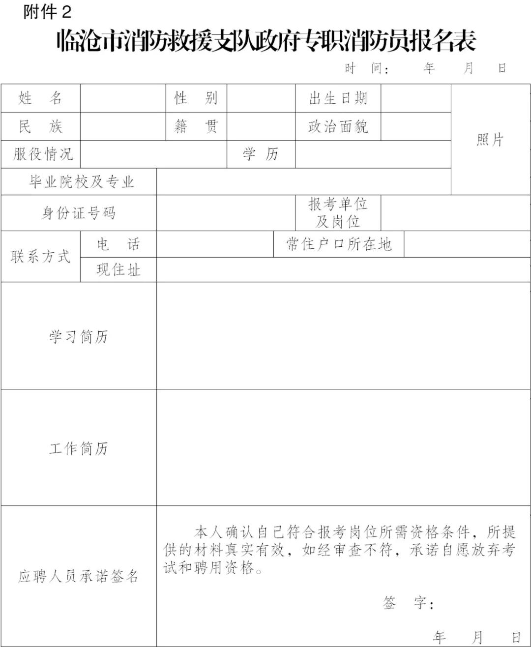 电子版《临沧市消防救援支队政府专职消防员报名表》下载地址:
