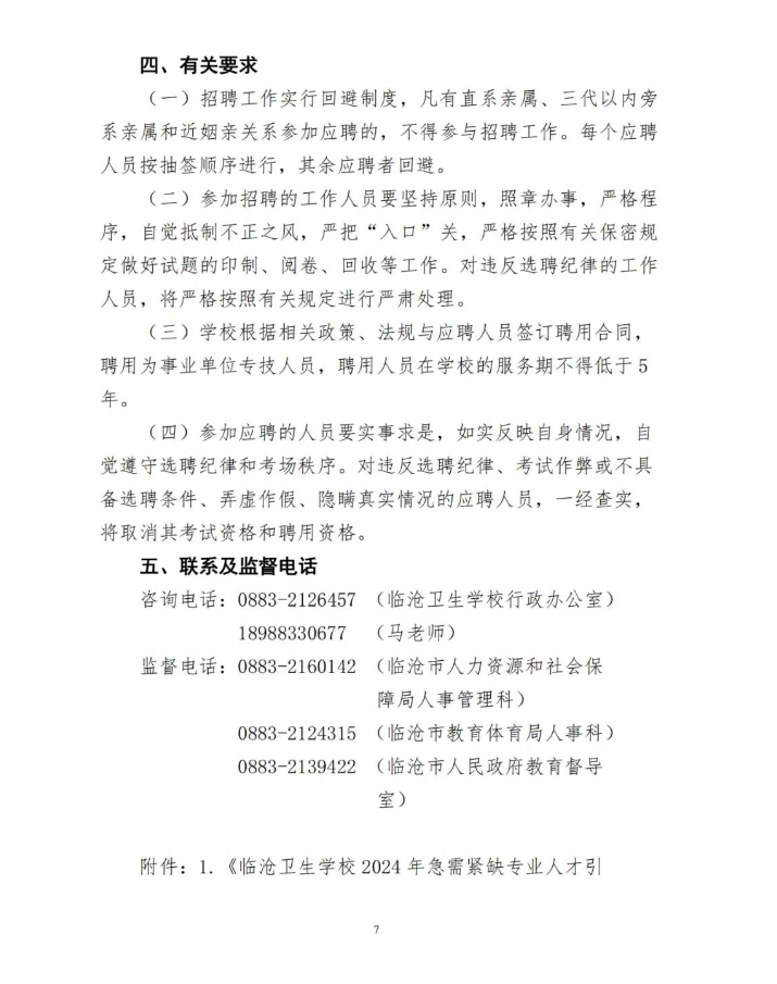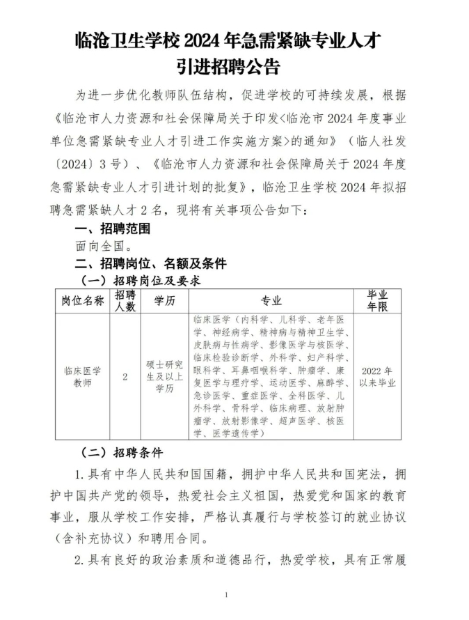 临沧卫生学校2024年急需紧缺专业人才引进招聘公告