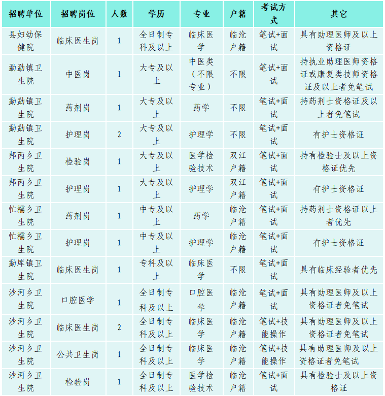 沙河乡卫生院:临床医生考试范围《诊断学》,口腔医生考试范围《口腔医学基础》,检验岗考试范围为医学检验技术相关专业知识。