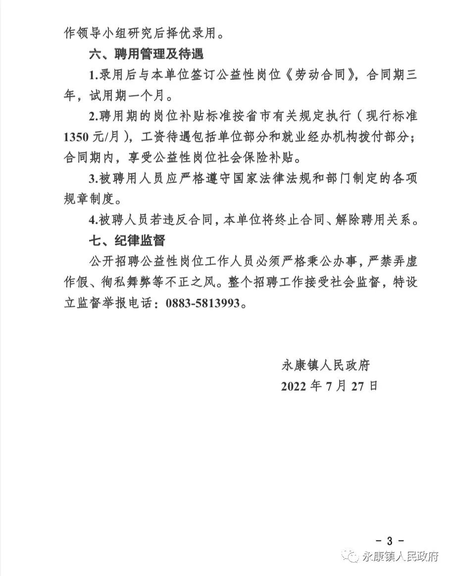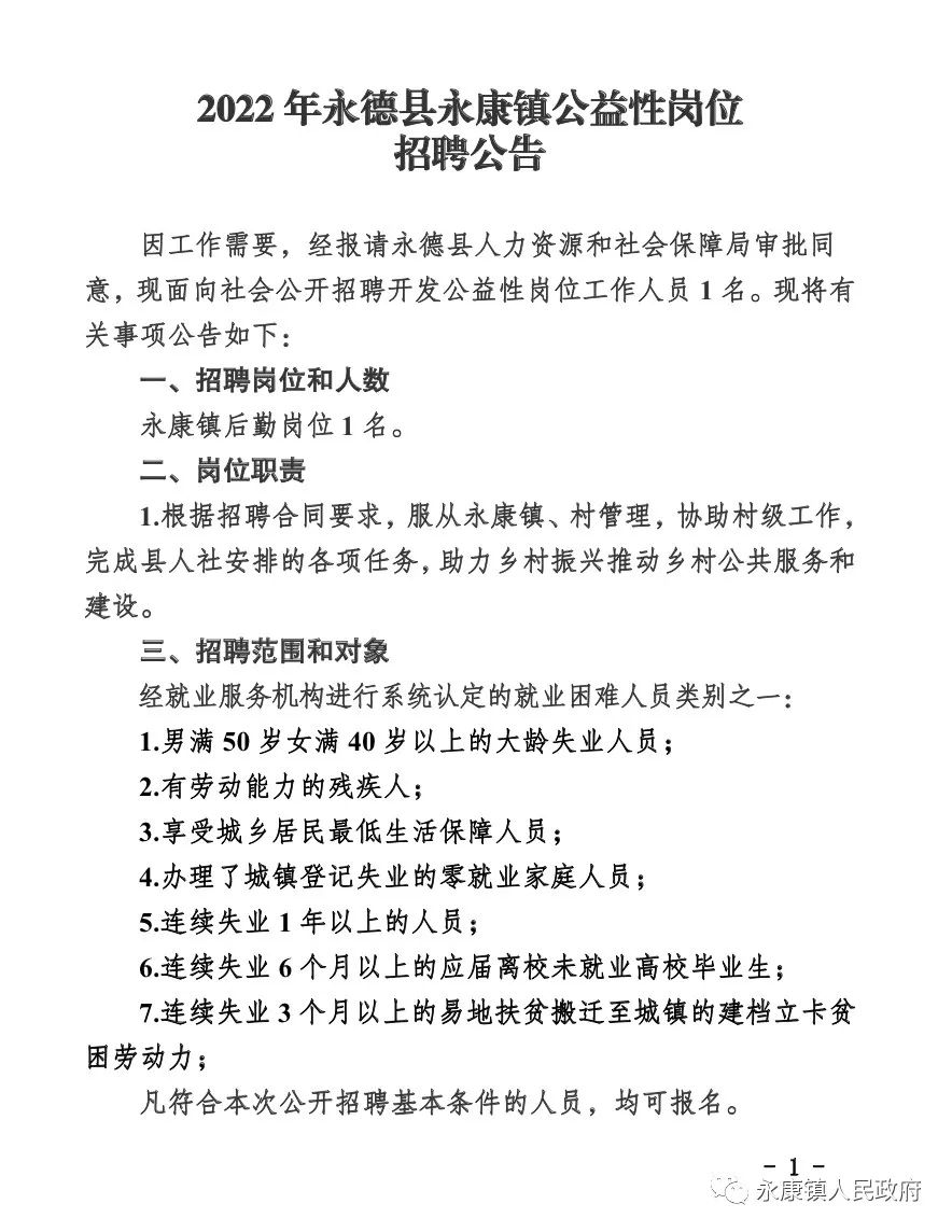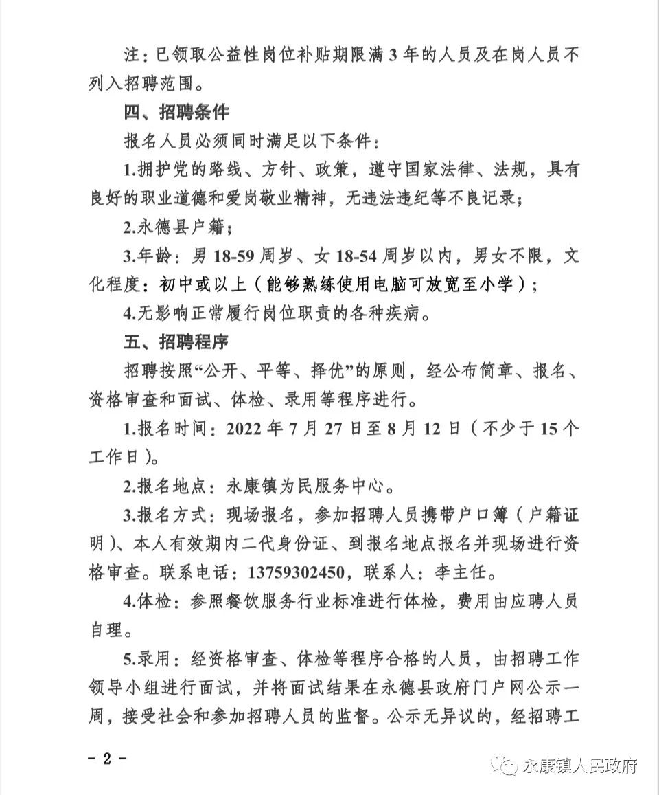 2022年永德县永康镇公益性岗位招聘公告