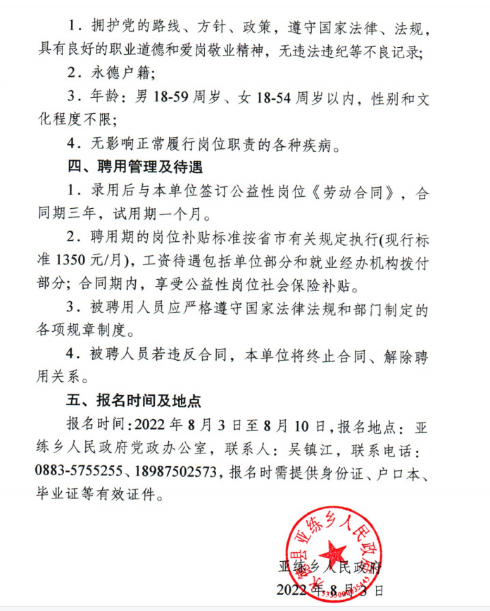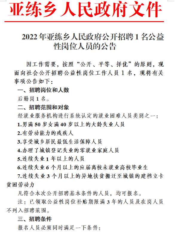 2022年亚练乡人民政府公开招聘1名公益性岗位人员的公告