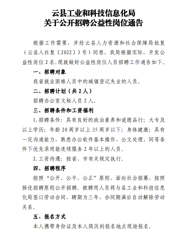 云县工业和科技信息化局关于公开招聘公益性岗位通告