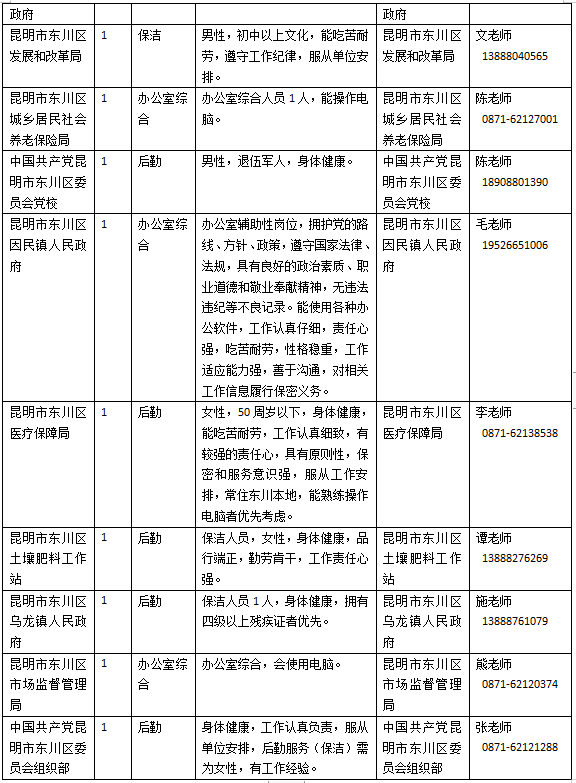根据《昆明市人力资源社会保障局 昆明市财政局关于做好公益性岗位开发管理有关工作的通知》 (昆人社通[2020])37号)文件精神,做好公益性岗位的开发管理工作,充分发挥公益性岗位“兜底线、救急难、促脱贫”的作用,因工作需要,现将昆明市东川区招聘公益性岗位工作人员有关事宜公告如下:
