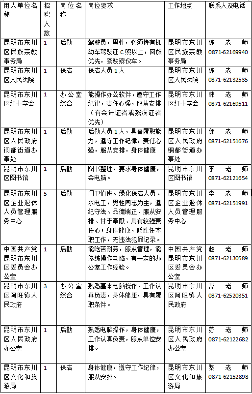 昆明市东川区民族宗教事务局等拾个单位公益性岗位招聘启事