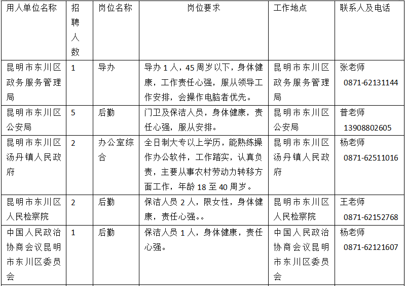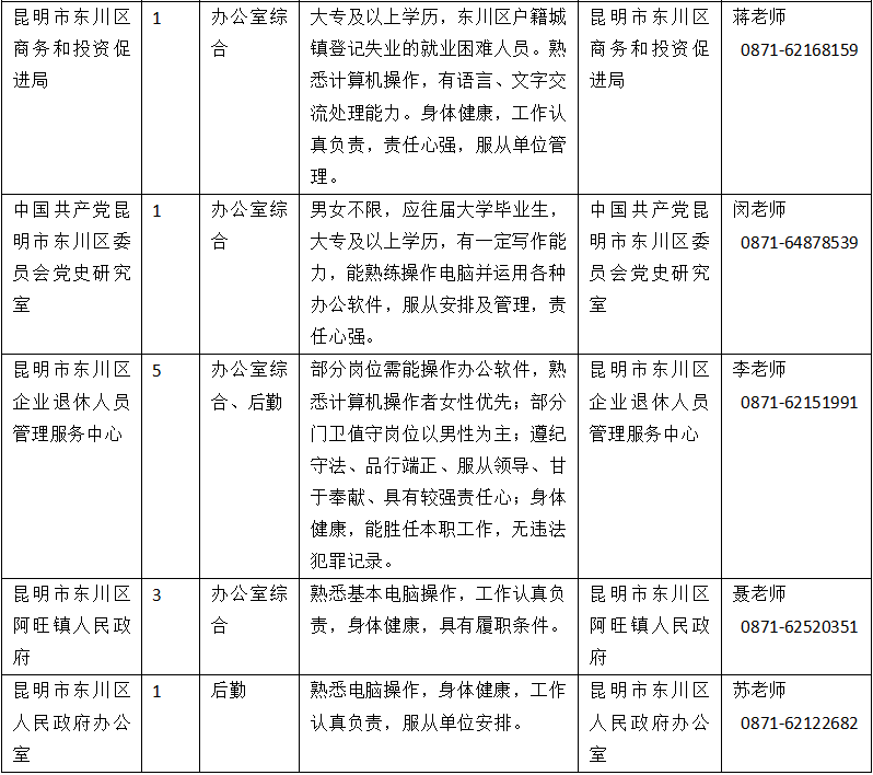 昆明市东川区政务服务管理局等拾个单位公益性岗位招聘启事