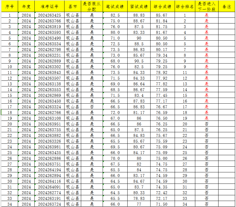 根据砚山县2024—2025年度大学生志愿服务西部计划省级地方项目志愿者招募程序和《关于做好2024—2025年度云南省大学生志愿者服务西部计划地方项目志愿者招募派遣工作的通知》、《关于做好文山州2024-2025年度西部计划省级地方项目志愿者招募工作的通知》文件要求,砚山县大学生西部计划项目管理办公室已于7月4日举行了公开面试,现将招募人员笔试成绩、面试成绩、综合成绩(笔试成绩×50%+面试成绩×50%,面试、综合成绩通过计算四舍五入保留两位小数。)公示如下(公示时间为2024年7月5日-2023年7月9日):
