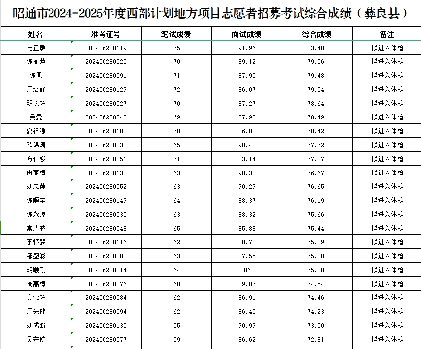附件1 昭通市2024-2025年度云南省大学生志愿服务西部计划地方项目志愿者招募考试综合成绩