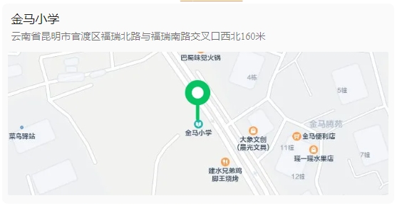 官渡区金马小学建于公元1911年,是一所有着百年建校历史的全日制公办小学,2023年搬迁到新校区,位于官渡区金马街道办事处东骧社区(近地铁3号线金马寺站)。现学校共有三个校区,分别是明玥半山校区、黑土凹校区、金马寺校区。学校有在校生4022人,80个教学班,教职工193人。学校配备了高标准的科学实验室、图书室、书法室、音乐室、美术室、劳动教室、心里咨询室、信息教室、舞蹈室、创客空间、体育器械室、室内体育场馆等,为学生全面发展提供了无限可能。同时,学校还将在办学特色上进一步挖掘、对校园文化、实践基地、书育空间、艺术审美等场景美学进行高度统整,尽快实现学校特色、内涵发展。