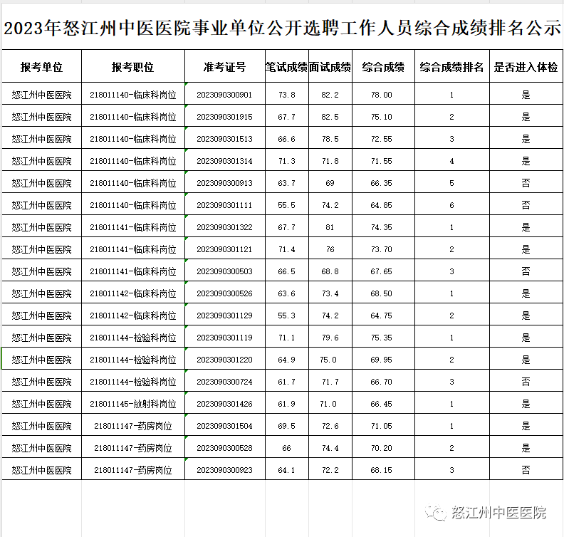 怒江州中医医院2023年公开选聘事业单位工作人员综合成绩及是否进入体检程序公示