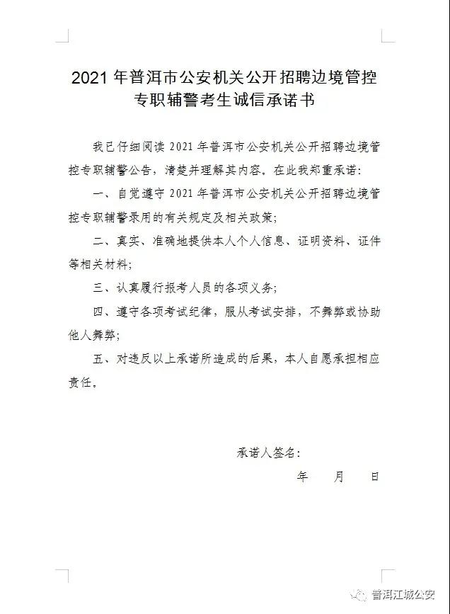 2021年普洱市公安机关公开招聘边境管控专职辅警考生诚信承诺书