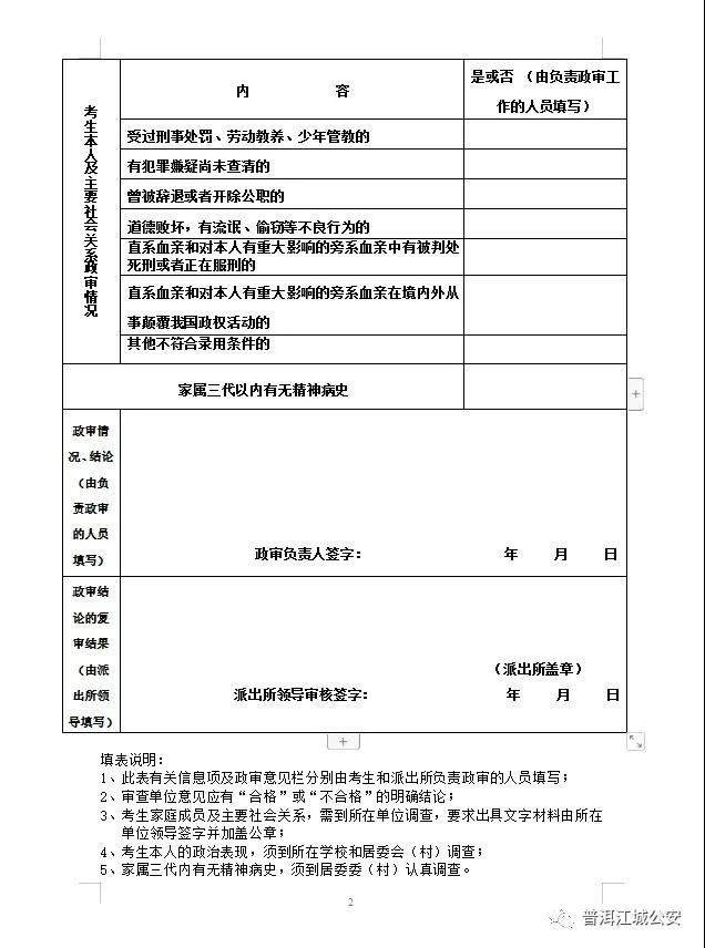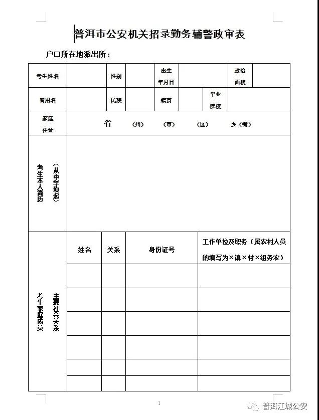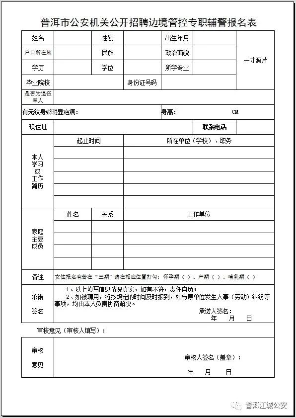 附:普洱市公安机关公开招聘边境管控专职辅警报名表