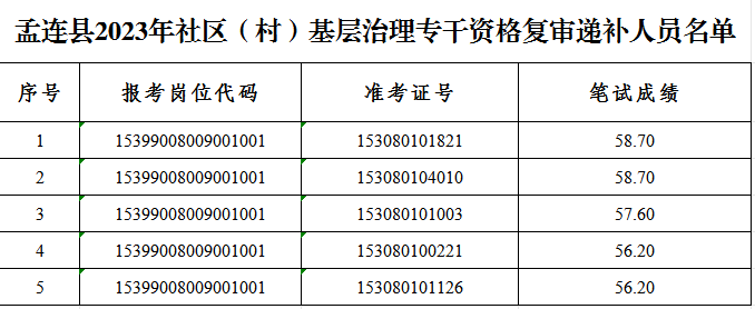 报考孟连县2023年社区(村)基层治理专干、符合《云南省2023年社区(村)基层治理专干招聘公告》规定的进入资格复审第一批次递补的人员。
