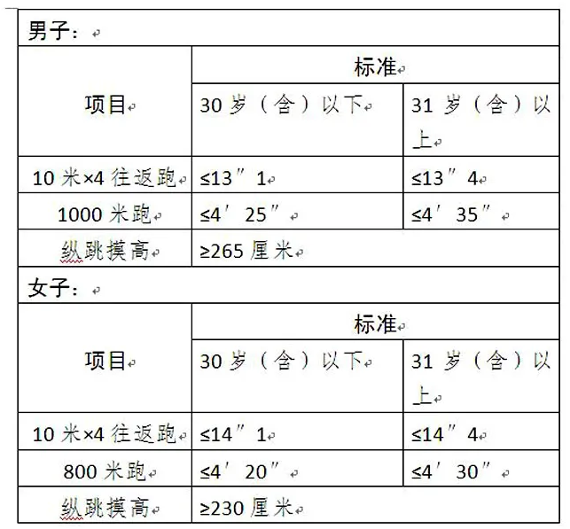 其标准按照招录人民警察标准(人社部发〔2011〕48号)执行,达不到以下标准的视为体能测试不合格。