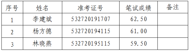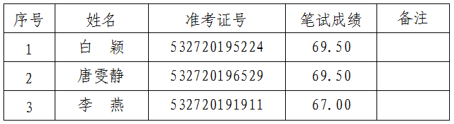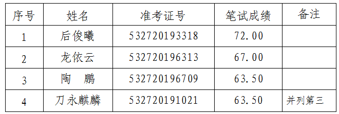 根据《普洱市卫生健康委员会2019年公开遴选事业单位工作人员公告》(第1号),普洱市卫生健康委员会于2019年12月7日组织开展了“普洱市人民医院口腔医师职位(职位代码C003001)”“普洱市中医医院临床医师职位(岗位代码C005002)”“普洱市第二人民医院财务会计职位(职位代码C004001)”“普洱市妇幼保健院办公室综合管理职位(岗位代码C006002)”公开遴选的笔试工作。现将有关事项公告如下:
