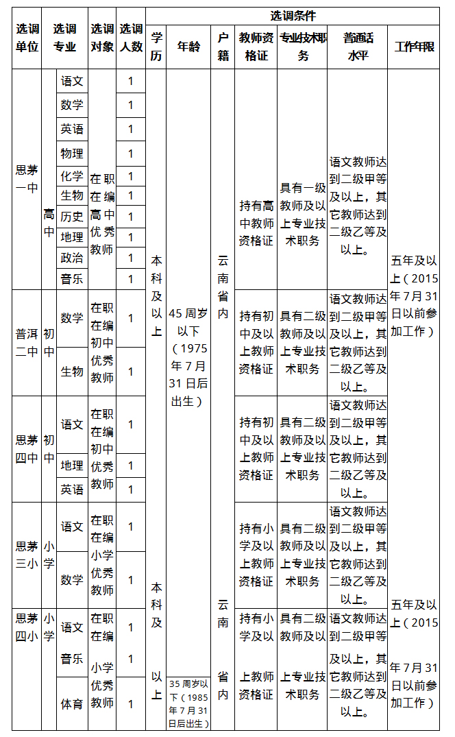 思茅区2020年公开选调在职优秀教师公告