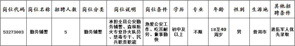 本次招录共设1个岗位,男性5人。详情请关注西“西盟警方”微信公众号查询。