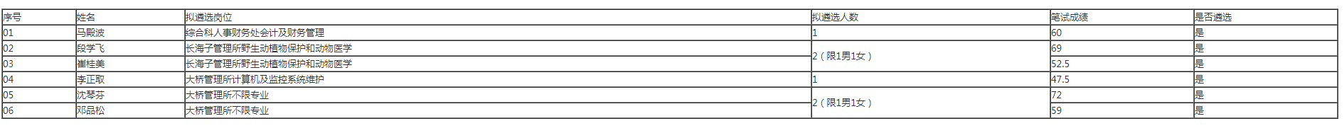 根据《中共会泽县委办公室 会泽县人民政府办公室关于印发<会泽县机关事业单位人员调配办法(试行)>的通知》(会办发〔2010〕48号)、《中共会泽县委办公室 会泽县人民政府办公室关于印发<会泽县事业单位公开招聘人员试行办法>的通知》(会办发〔2012〕44号)和《中共会泽县委办公室 会泽县人民政府办公室关于转发〈曲靖市市属事业单位公开遴选工作人员实施办法(试行)〉的通知》(会办通〔2017〕64号)精神,按照《会泽黑颈鹤国家级自然保护区管护局2019年事业单位公开遴选工作人员实施方案》和公告要求,公开报名、资格审查、笔试、体检、考察等工作,在会泽黑颈鹤国家级自然保护区管护局事业单位工作人员选调工作领导小组的精心组织下,均已按程序认真开展,经中共会泽黑颈鹤国家级自然保护区管护局党组研究决定,拟遴选马殿波等6位同志为我局全额拨款事业单位工作人员(名单附后),现予以公示。