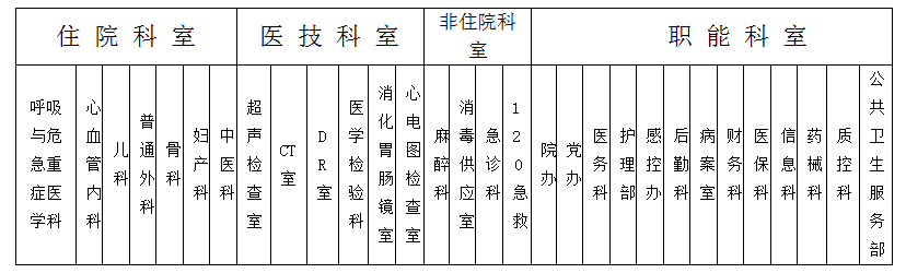 医院开展的业务有:普通外科开展肋骨骨折切开复位内固定术、血气胸闭式引流术、肺大泡切除术、胃次全切除术、胃大部切除术、胆囊切除术(LC)、胆总管切开取石引流术及前列腺电切术、经皮肾穿刺取石术、甲状腺次全切除术、脾破裂切除术、肝左外叶切除术、肝脾破裂修补术、阑尾切除术等;妇产科开展子宫阴式或者腹式全切术、次全切术、剖宫产、卵巢囊肿摘除、产后修复如盆底修复等手术;骨科开展四肢长骨骨折外固定及切开内固定术、脊柱骨折切开减压内固定术、椎体成形术、全髋置换术等;心血管内科开展冠心病、急性冠脉综合征(急性心肌梗死、不稳定心绞痛)、高血压、心力衰竭、心律失常、风湿性心脏病、心肌病等心血管疾病的诊断及治疗并有着丰富的经验;呼吸内科开展慢性肺源性心脏病、慢性阻塞性肺疾病、阻塞性肺气肿、急性及慢性支气管炎、肺炎、支气管哮喘、支气管扩张、慢性心衰、呼吸衰竭、小细胞低色素性贫血、失血性贫血等常见病、多发病的临床诊治;内分泌科开展各型糖尿病的诊治,如糖尿病酮症酸中毒的抢救、骨质疏松、原发性醛固酮增多症、尿崩症、痛风、甲状腺疾病、血脂异常等疾病的诊断及治疗;消化内科开展胃炎、消化性溃疡、炎症性肠炎、消化道出血等疾病的诊断及治疗;农药中毒抢救及儿科常见多发病的诊治;中医科开展针灸、推拿等特色治疗,并取得满意的治疗效果。
