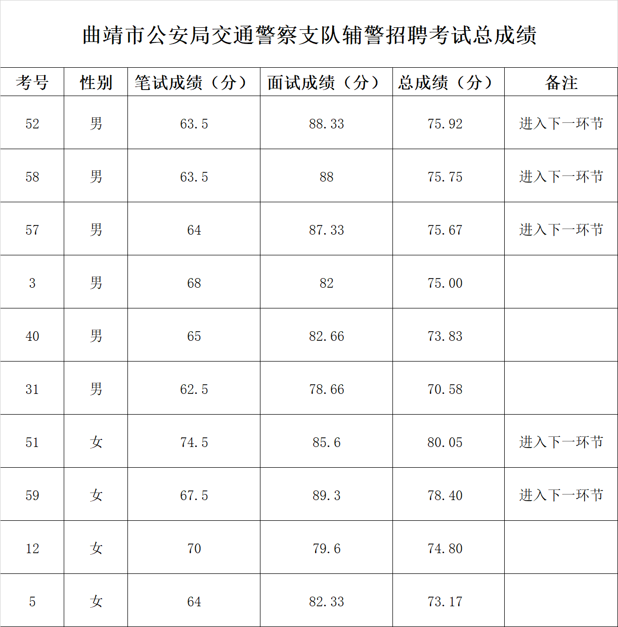 根据《曲靖市公安局交通警察支队关于公开招聘辅警的公告》规定,经过笔试和面试,现将2024年曲靖市公安局交警支队公开招聘辅警总成绩予以公布。按总成绩由高到低的顺序及招聘辅警人数要求,确定5名考生进入下一环节,请5名考生于4月7日15时在西关小学田径场(曲靖青少年足球训练基地)集合,组织开展体能测试,逾期不到者视为放弃资格。