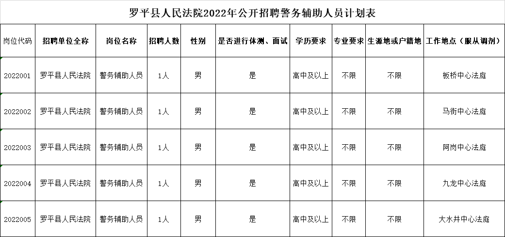 公开招聘警务辅助人员5名(限男性):五个中心法庭(板桥中心法庭、马街中心法庭、阿岗中心法庭、九龙中心法庭、大水井中心法庭)各招聘1名。(详见招聘计划表)