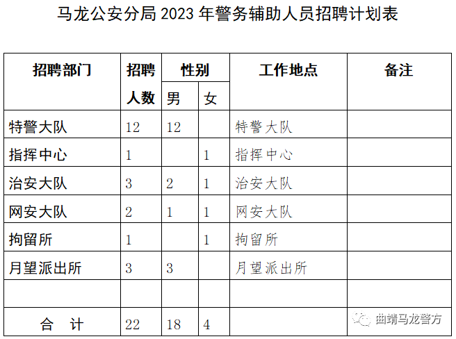 曲靖市公安局马龙分局计划公开招聘警务辅助人员22名,其中男性18名、女性4名。