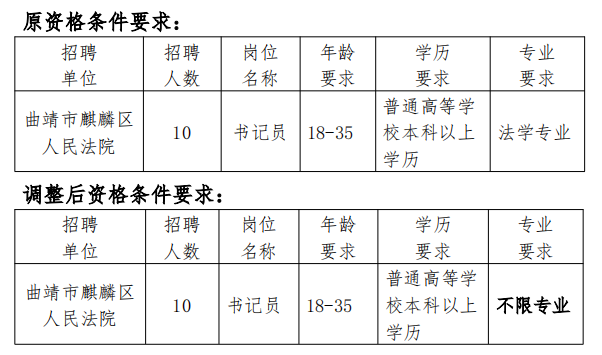 根据《曲靖市麒麟区人民法院2025年公开招聘聘用制书记员公告》的报名资格审查情况,经研究,决定放宽岗位的招聘条件,具体如下: