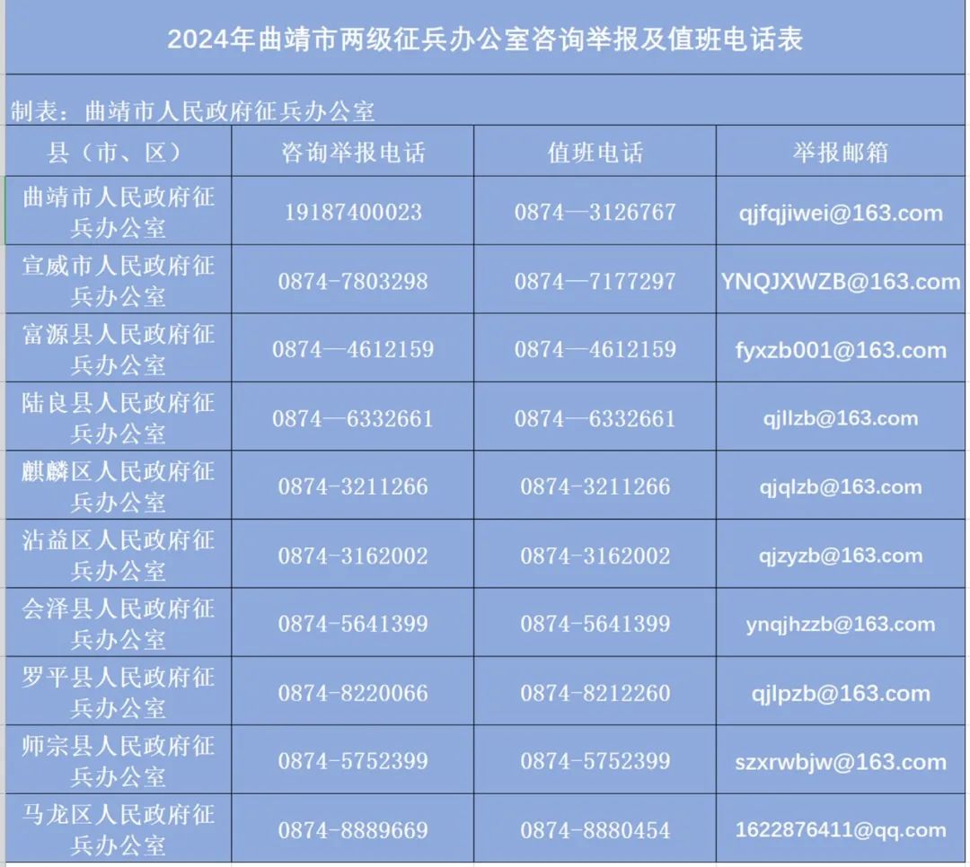 参加兵役登记是法律赋予每个适龄男性公民应尽的光荣义务和神圣责任。根据《中华人民共和国兵役法》《征兵工作条例》《云南省征兵工作条例》,现将曲靖市2024年兵役登记有关事项通告如下: