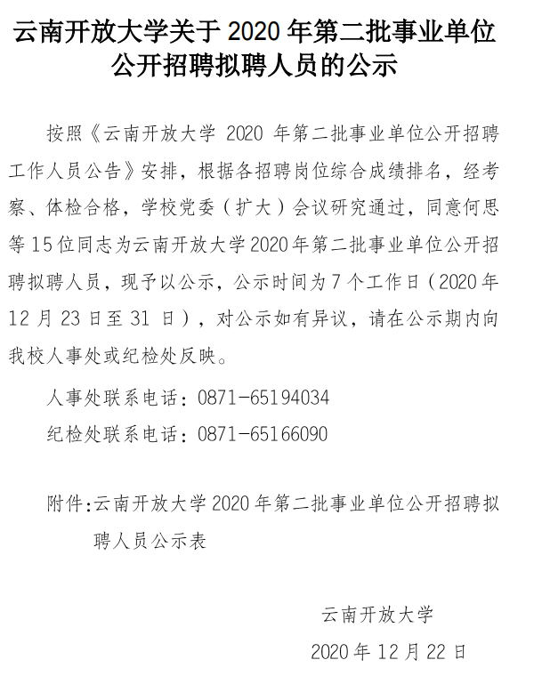 云南开放大学关于2020年第二批事业单位公开招聘拟聘人员的公示