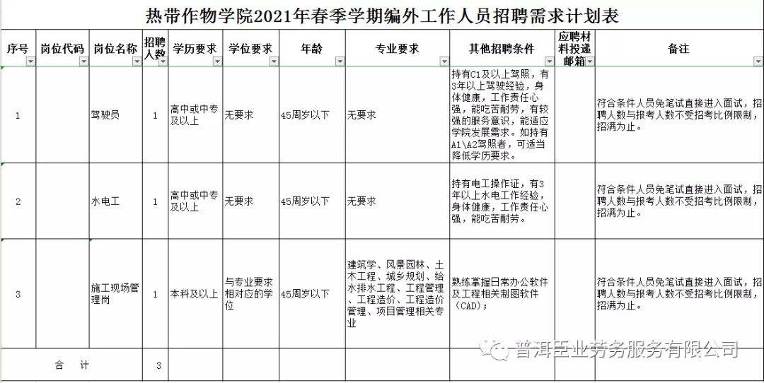 招聘岗位人数 3 名,均为云南农业大学热带作物学院非事业编制人员(即编制外合同制人员),实行劳务派遣用工方式,具体岗位信息详见附表。