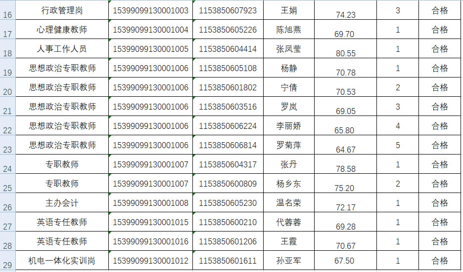 我校严格按照《事业单位公开招聘人员暂行规定》(中华人民共和国人事部令第6号)《云南省事业单位公开招聘工作人员办法》(云人社发〔2016〕182号)及《云南省事业单位公开招聘工作人员面试测评暂行办法》(云人社发〔2016〕405号)有关文件规定及《云南轻纺职业学院2020年第三批公开招聘事业单位工作人员公告》细则,于2020年10月24日全省统一笔试和12月5日学校面试两个阶段开展招聘工作,根据综合成绩排名经体检及考核考察阶段,学校于2021年1月11日组织召开了云南轻纺职业学院第1次院长办公会,确定拟聘用人员28人,现将拟聘用人员信息进行公示。