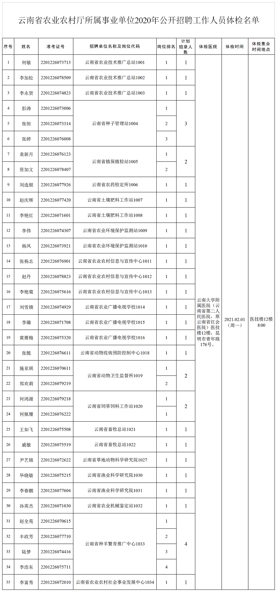 1.云南省农业农村厅所属事业单位2020年公开招聘工作人员体检名单.xls