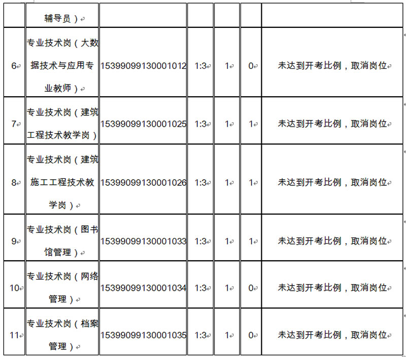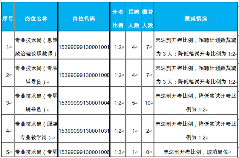 根据《云南省事业单位公开招聘工作人员办法》(云人社发〔2016〕182号)及《云南轻纺职业学院2021年第一批公开招聘事业单位工作人员公告》要求等有关文件规定,截止至2021年4月27日24时,结合我校此次招聘各岗位实际报名缴费情况,经云南省教育厅及云南省人力资源和社会保障厅批准,现将我校招聘岗位裁减及降低笔试开考比例情况公布如下: