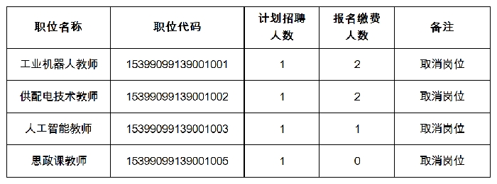 根据《云南省事业单位公开招聘工作人员办法》(云人社发〔2016〕182号)和云南省人力资源和社会保障厅批准发布实施的《云南省电子信息高级技工学校2021年事业单位公开招聘工作人员公告》,对缴费人数与拟招聘人数比例未达3:1的岗位予以取消。本次取消的招聘岗位如下: