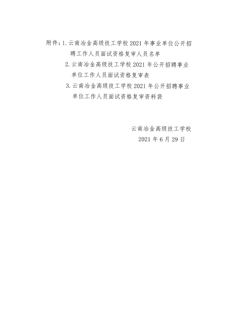 关于参加云南冶金高级技工学校2021年公开招聘事业单位工作人员面试资格复审公告