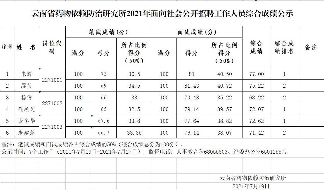 云南省药物依赖防治研究所2021年面向社会公开招聘工作人员综合成绩公示