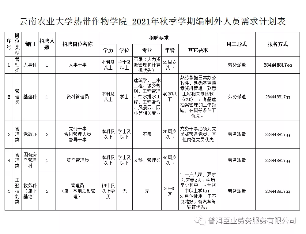 结合云南农业大学热带作物学院工作的需要,拟面向社会公开专项招聘非事业编制工作人员18名,现将招聘相关事宜公告如下: