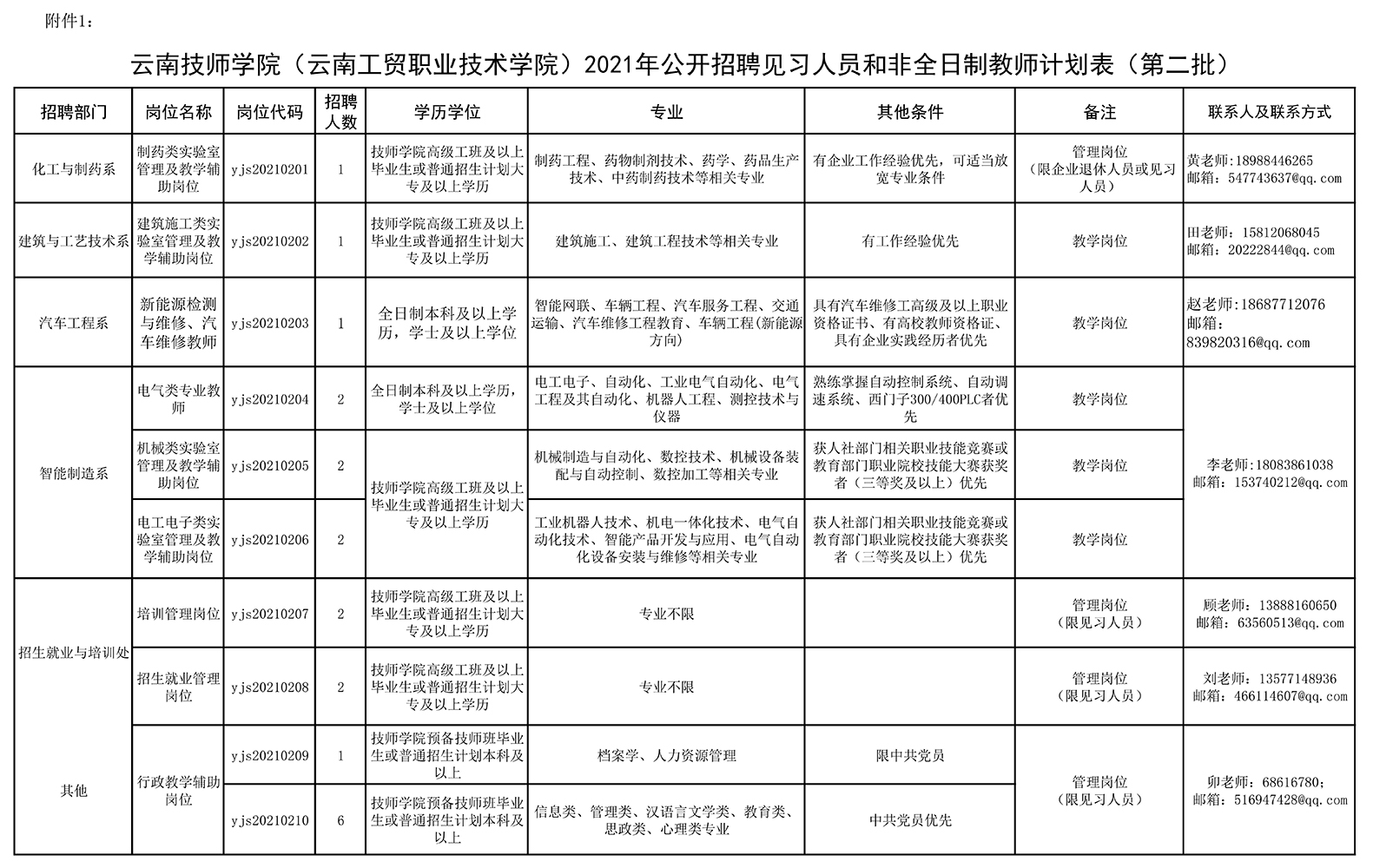 附件:1.云南技师学院(云南工贸职业技术学院)2021年公开招聘编制外见习人员和非全日制教师计划表(第二批)